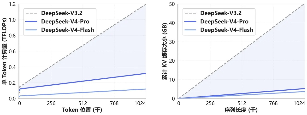 DeepSeek-V4 和 DeepSeek-V3.2 的计算量和显存容量随上下文长度的变化