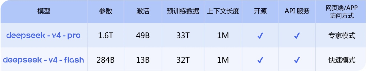 即日起登录官网 chat.deepseek.com 或官方App,即可与最新的 DeepSeek-V4 对话,探索 1M 超长上下文记忆的全新体验。API 服务已同步更新,通过修改 model_name 为 deepseek-v4-pro 或 deepseek-v4-flash 即可调用。
