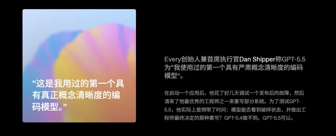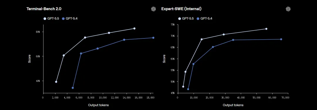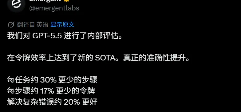 编码调试能力尤其强,跟 5.4 相比,在相同 Codex 任务的情况下, 5.5 消耗的token明显更少,在保证速度的同时,但输出质量更高。
