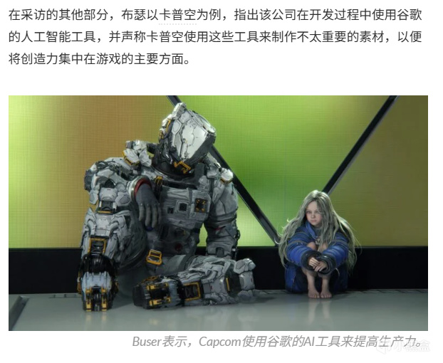 Buser 還拿卡普空做例子,稱其會用谷歌 AI 工具快速生成大量創意,再由美術總監篩選後交給團隊繼續打磨,把精力留給更重要的角色、主場景和關鍵內容。
