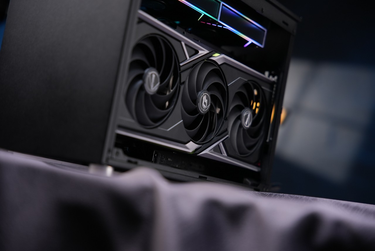 本套的显卡选择到了七彩虹的5070Ti火神,外观设计非常硬核且金属质感拉满;很多显卡的风扇面都设计的非常好看且各有特色,但是碰到常规的直插机箱无法完全展现其风扇面的优秀颜值,而背靠背的结构则可以将显卡的风扇面的颜值发扬光大