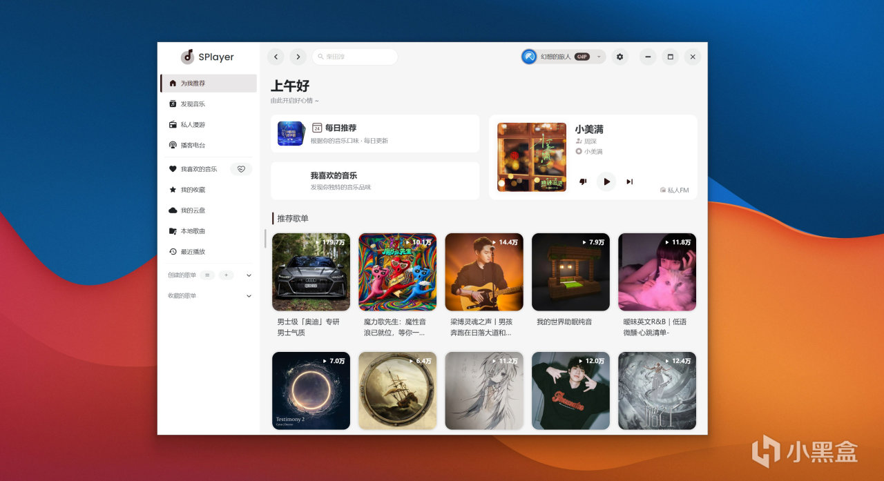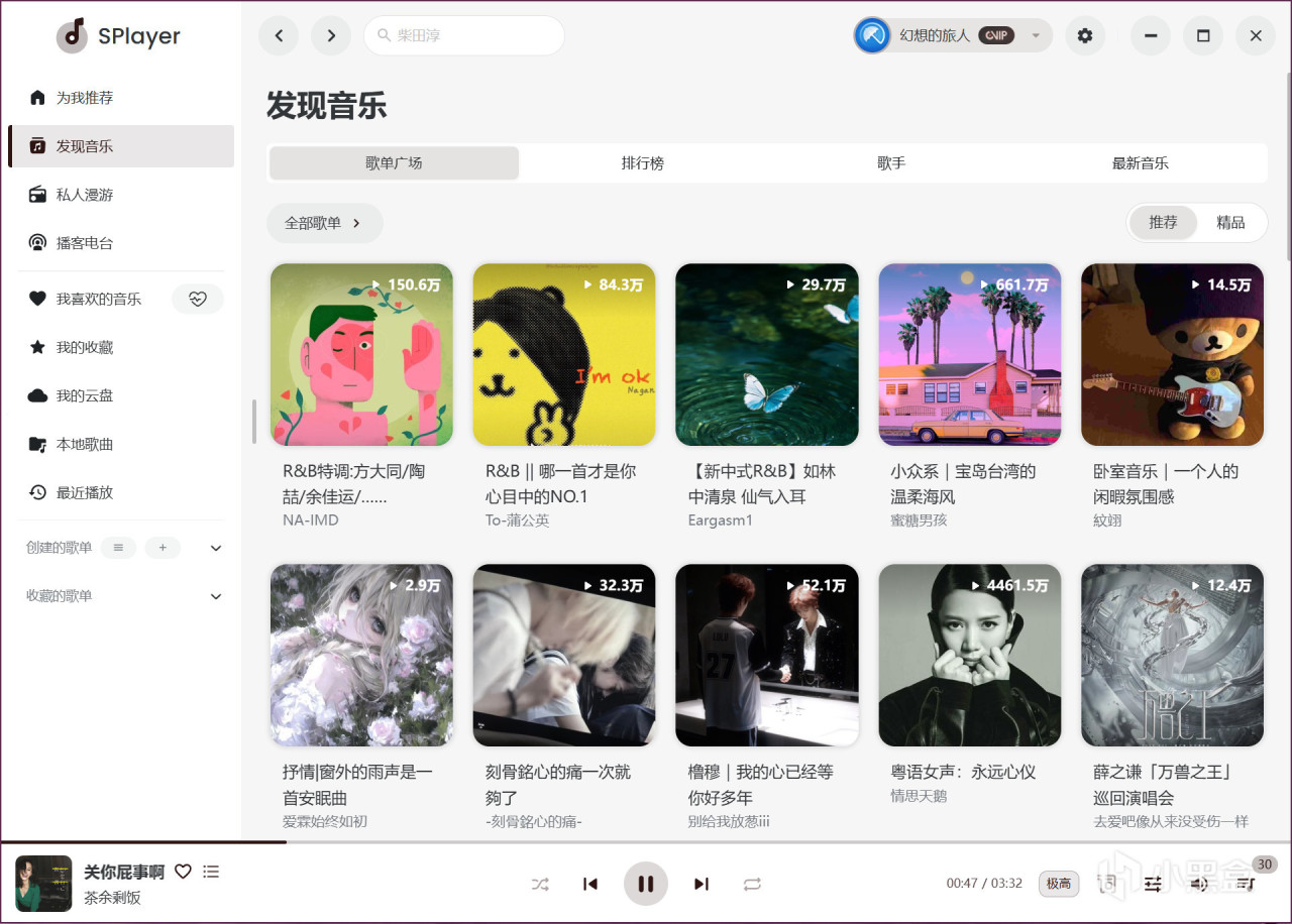 和官方平台一样,SPlayer 保留每日推荐歌曲、私人 FM,基于你的听歌习惯智能推荐,不用费心找歌,每天都有新惊喜。发现页集成排行榜、最新音乐、精品歌单、歌手分类,想听什么类型直接点,海量曲库任意听。