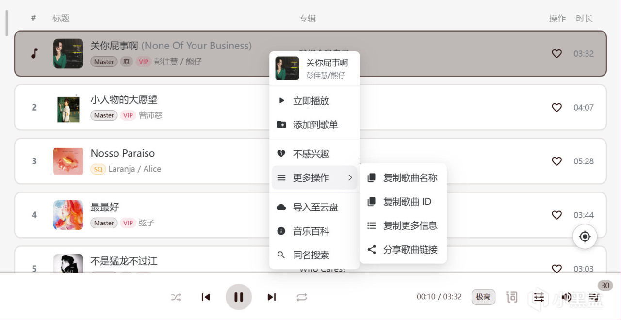 更良心的是,客户端支持很多官方平台灰掉、听不了的歌,在 SPlayer 里可以正常播放。