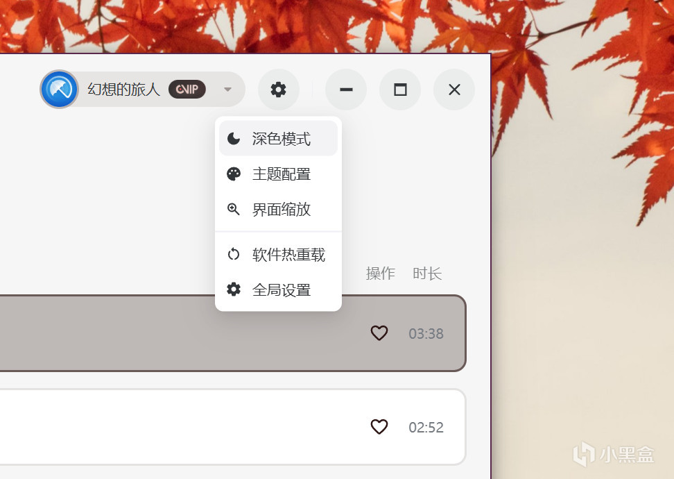 最惊艳的是封面主题色自适应功能。播放任意歌曲时,软件会自动提取专辑封面主色调,对整个界面进行全站着色,播放不同风格的音乐,界面就会呈现对应的氛围色彩,沉浸感直接拉满。白天用 Light 模式清晰明亮,晚上切换 Dark 模式护眼舒适,还支持 Auto 自动跟随系统主题切换,全天候使用都舒服。