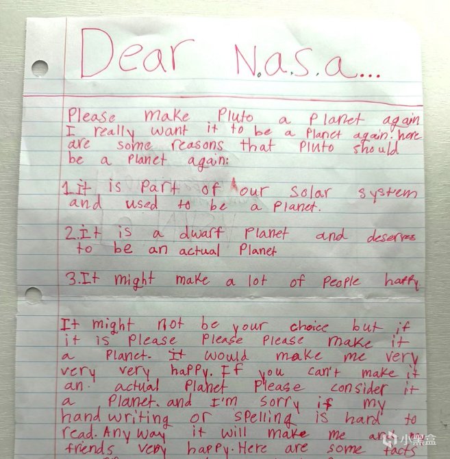 也許這不歸您決定,但如果可以的話,求求您,求求您讓它成爲行星吧。這會讓我非常非常非常開心。如果您不能讓它成爲正式的行星,也請您在心裏把它當作一顆行星。另外,如果我的筆跡或拼寫難以辨認,我先說聲抱歉。無論如何,這會讓我和我的朋友們非常開心。下面是一些事實……