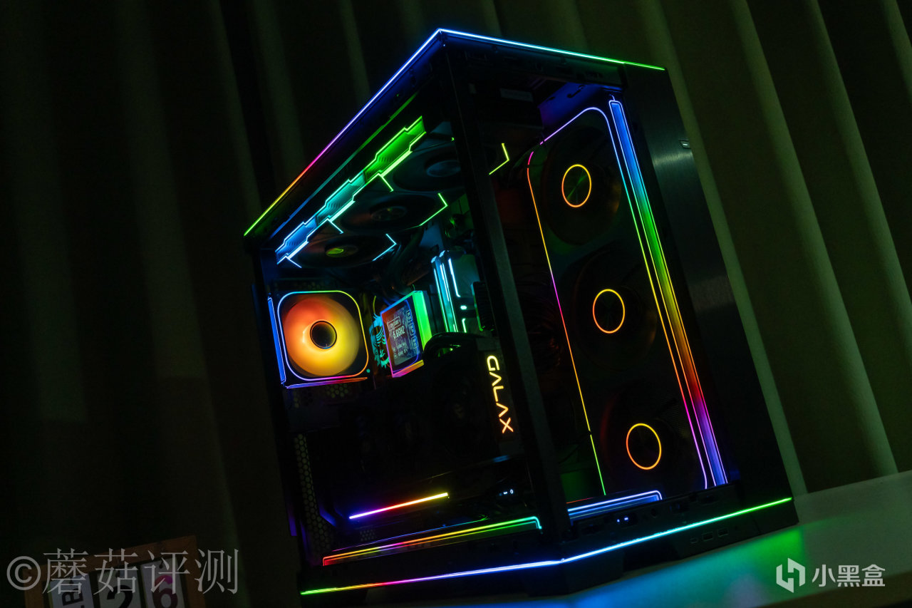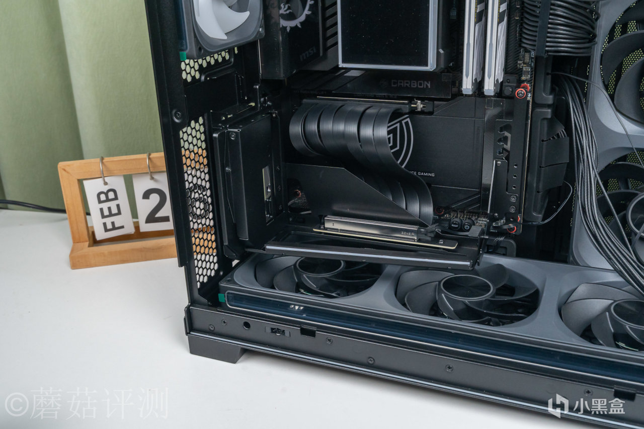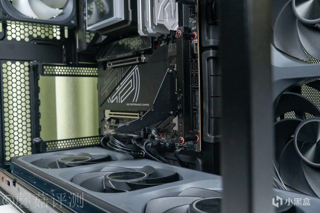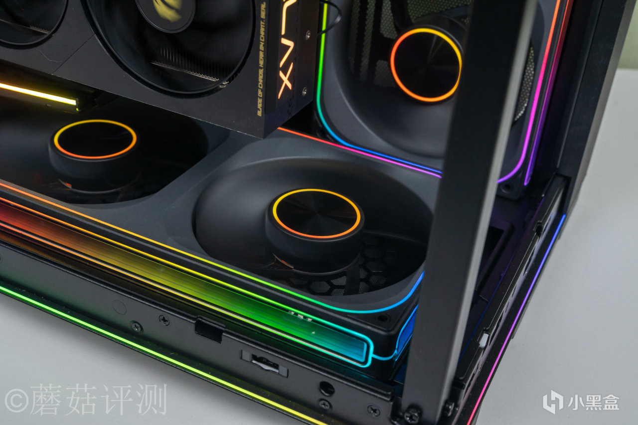 ▼機箱是聯力的包豪斯O11D EVO RGB版,這款機箱的側面、底部、頂部均支持3*140mm規格的機箱風扇,蘑菇在側面和底部安裝了兩把喬思伯的ZA420模組扇,反葉的,可以提供充足的進風。