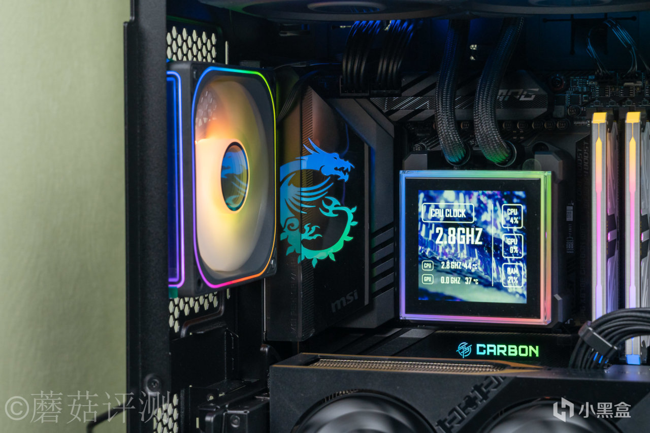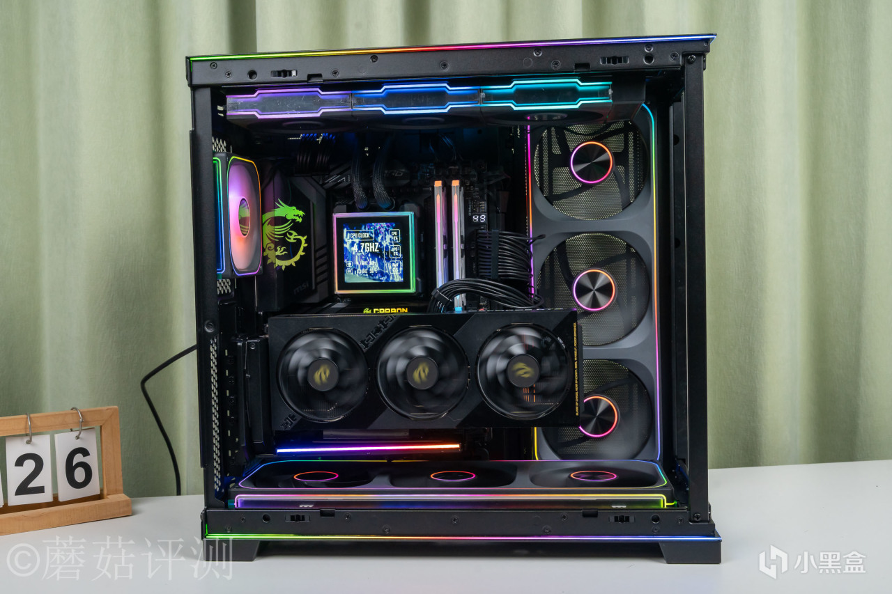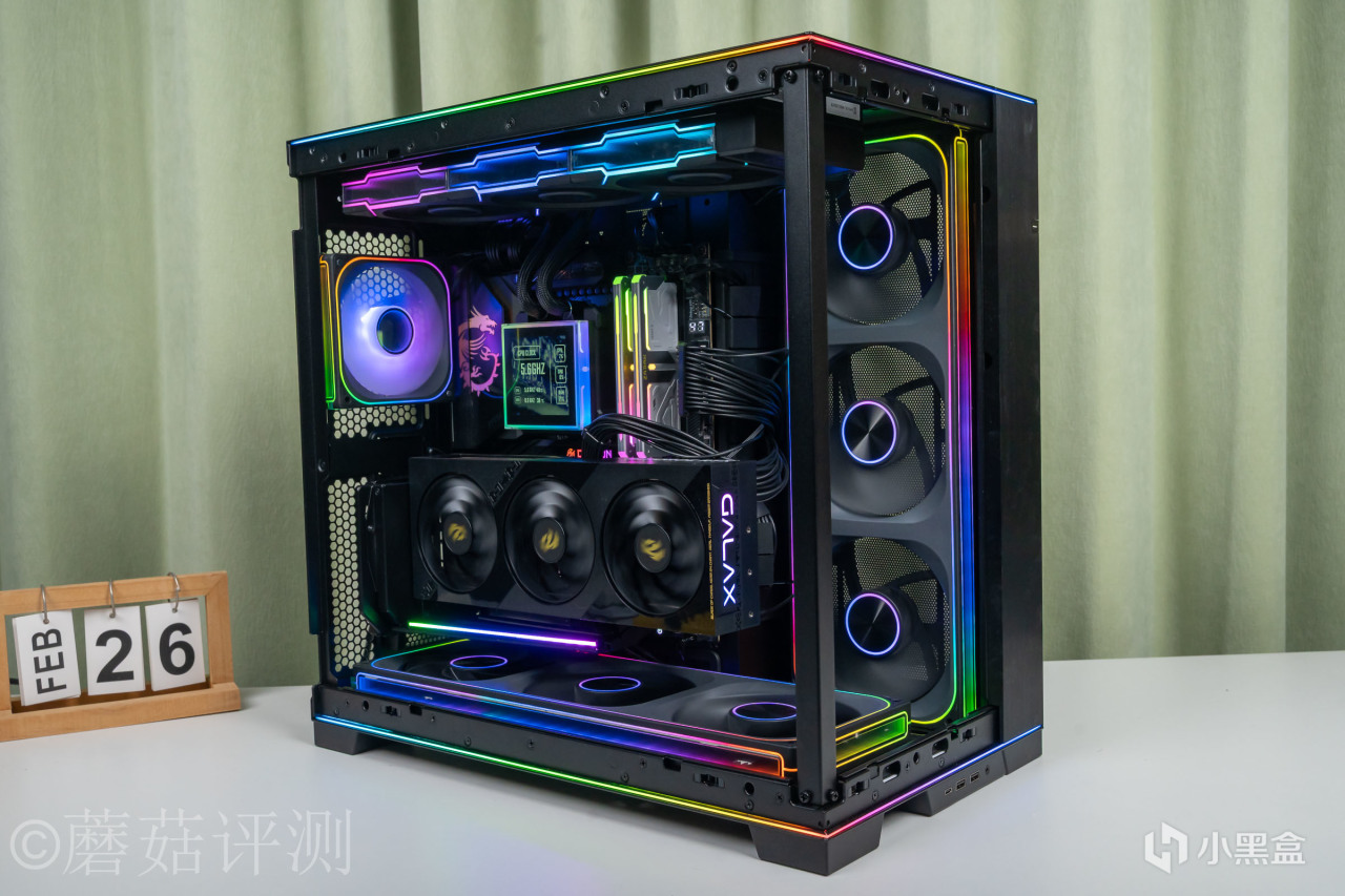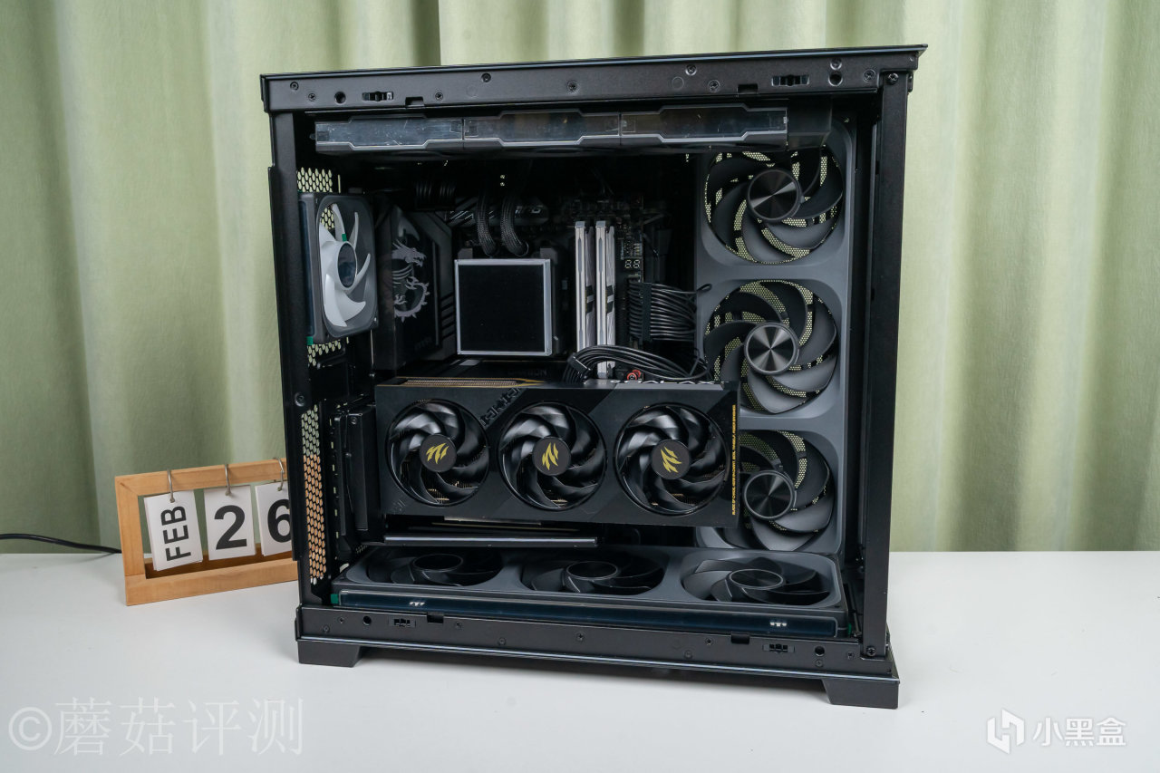 ▼機箱是聯力的包豪斯O11D EVO RGB版,這款機箱的側面、底部、頂部均支持3*140mm規格的機箱風扇,蘑菇在側面和底部安裝了兩把喬思伯的ZA420模組扇,反葉的,可以提供充足的進風。