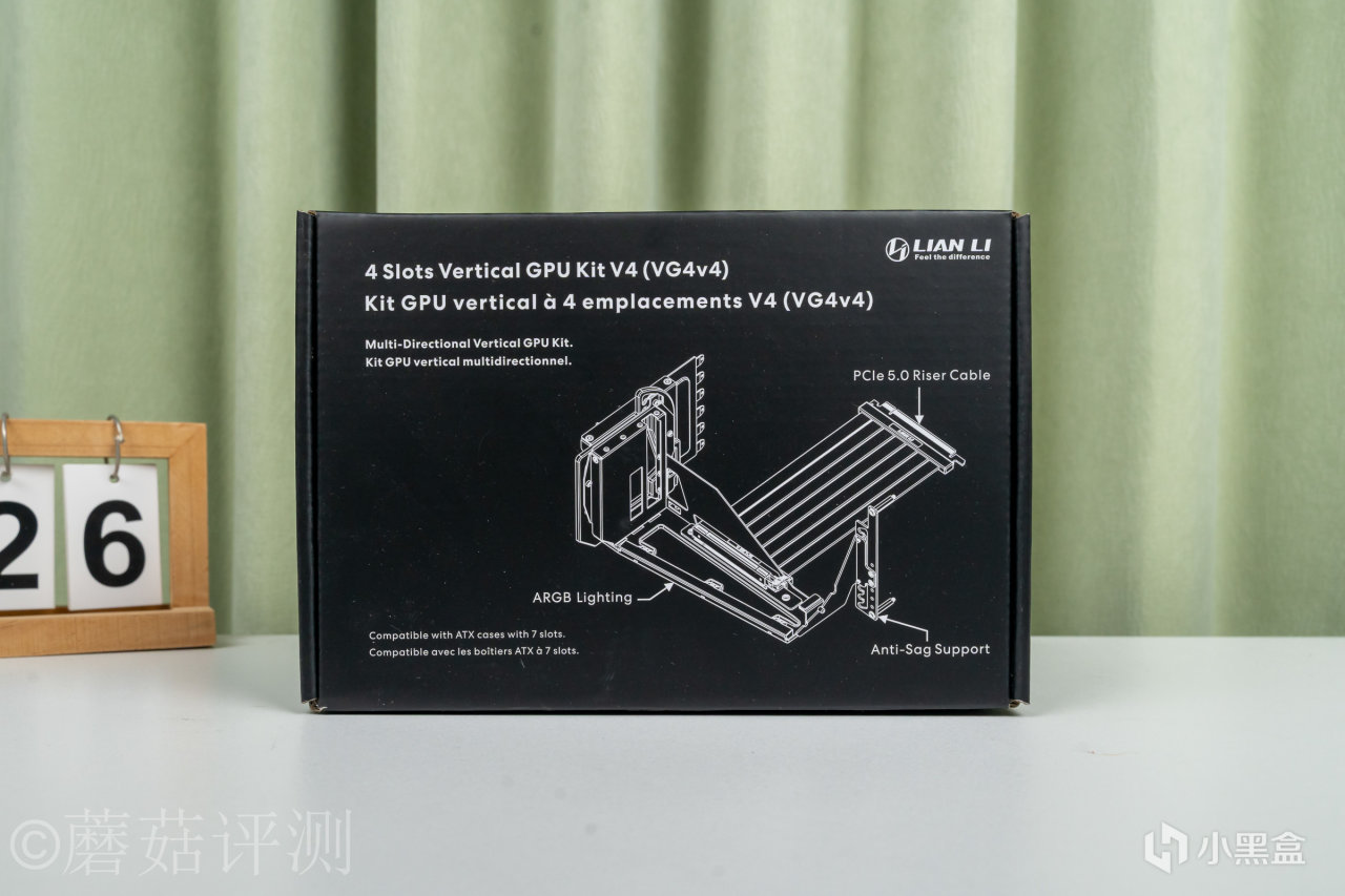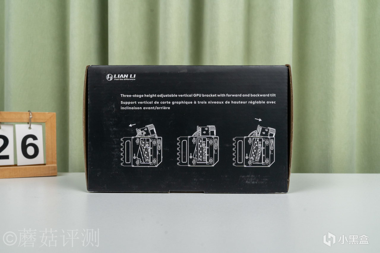 ▼顯卡支架的包裝很簡單,黑色的紙盒,正面白色的顯卡支架外觀圖,以及一些型號、參數之類的細節。
