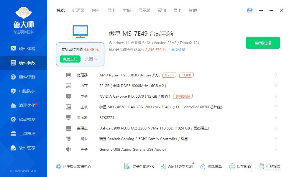 ▼整機配置一覽,處理器是9850X3D,主板是微星的X870E暗黑,顯卡是影馳的RTX 5070魔刃OC。