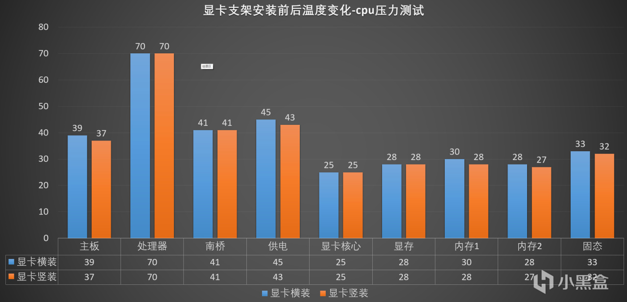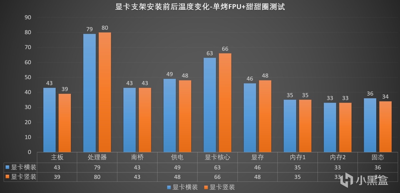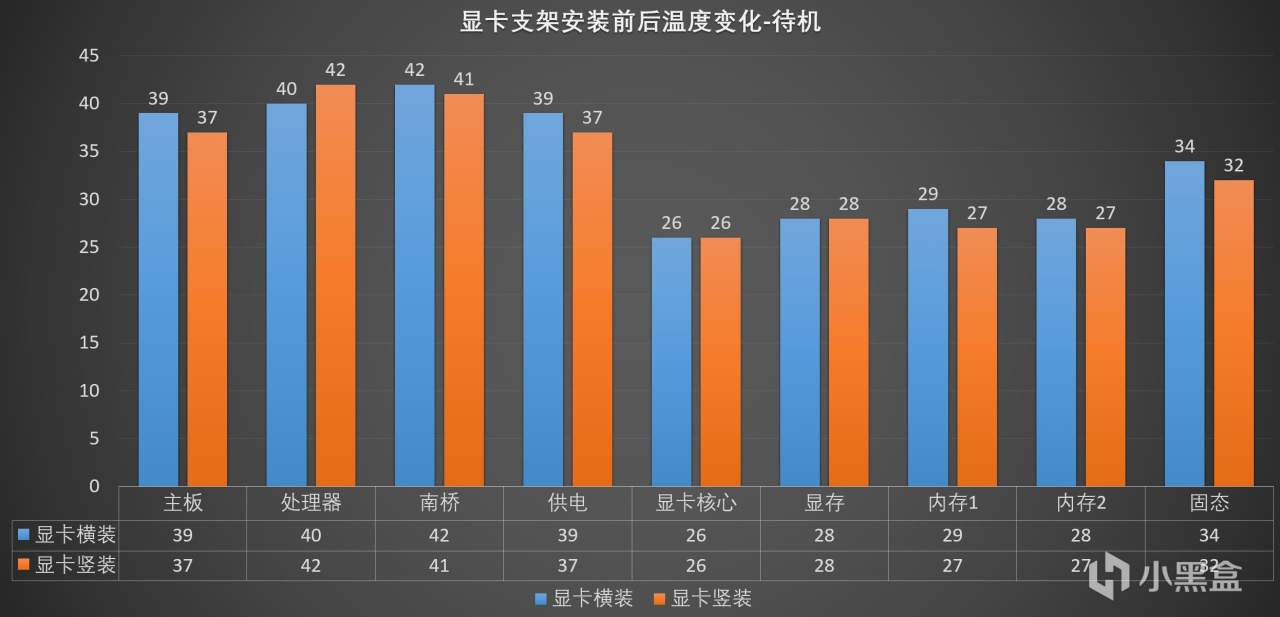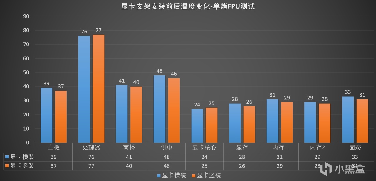 散熱方面,顯卡豎裝之後,顯卡自身的散熱效果是要略微差一丟丟的,但機箱內部的散熱效果,提高了不止一丟丟。搭配這款聯力O11D EVO RGB機箱,其採用經典的垂直風道設計,底部進風,主板上的南橋、內存、供電、固態溫度全部都有明顯的降低,面對海景房這種側面和前部均爲大面積側透玻璃的情況,也能給主板上的各種硬件提供出色的散熱效果。
