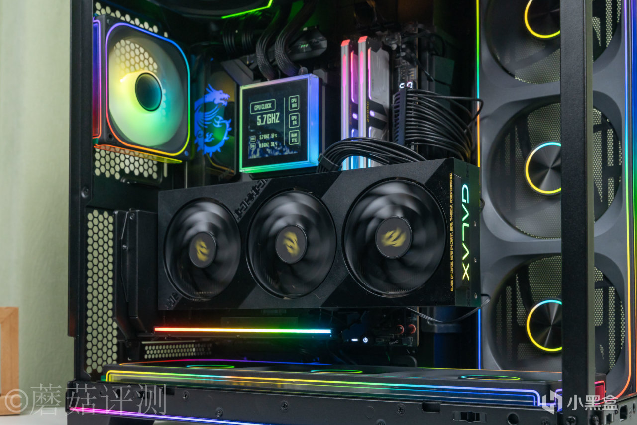 ▼影馳這張RTX 5070魔刃OC顯卡的RGB燈板採用磁吸式固定,可以固定到側面,也可以固定到尾部,這裏把這個燈板放到尾部。