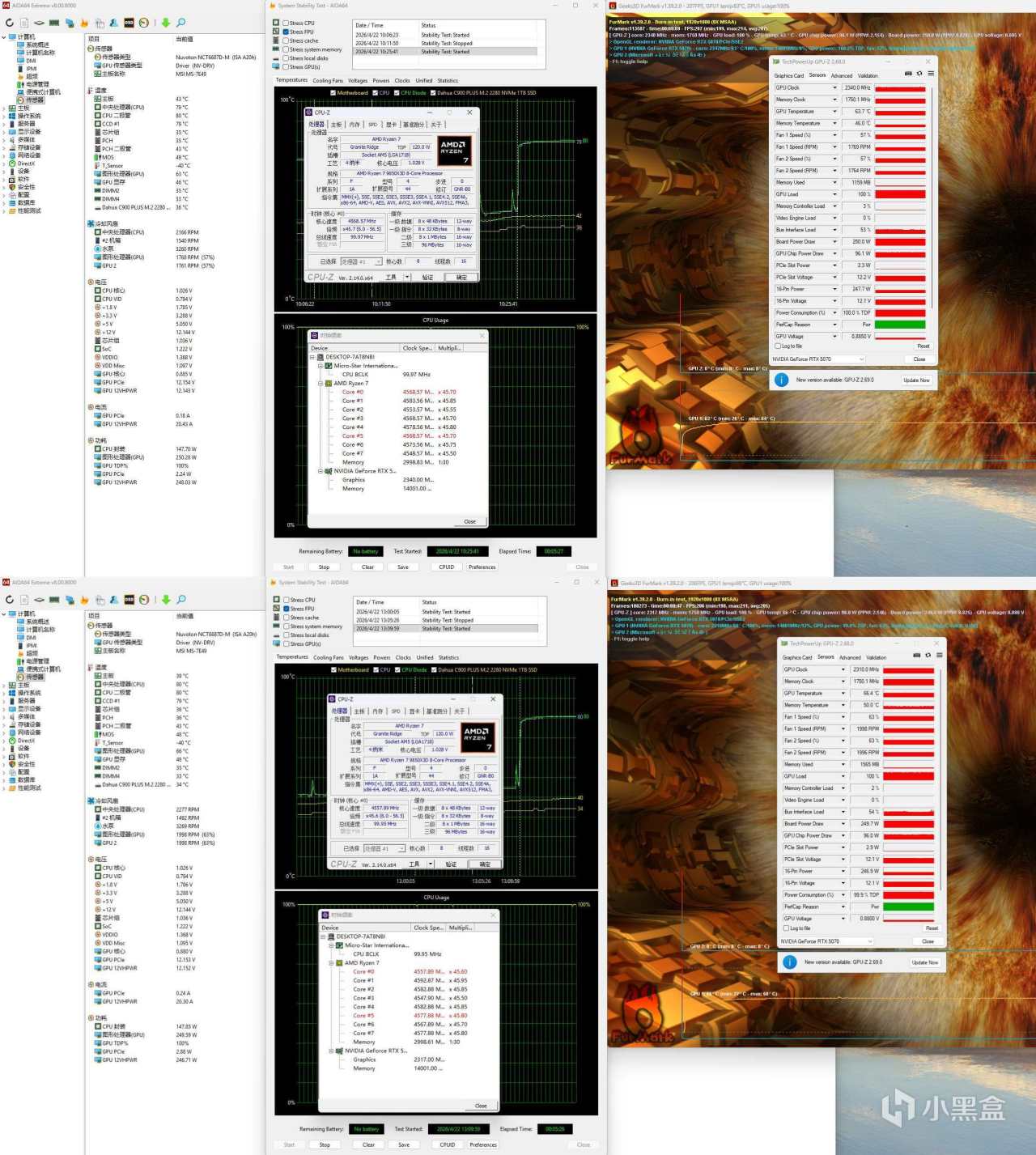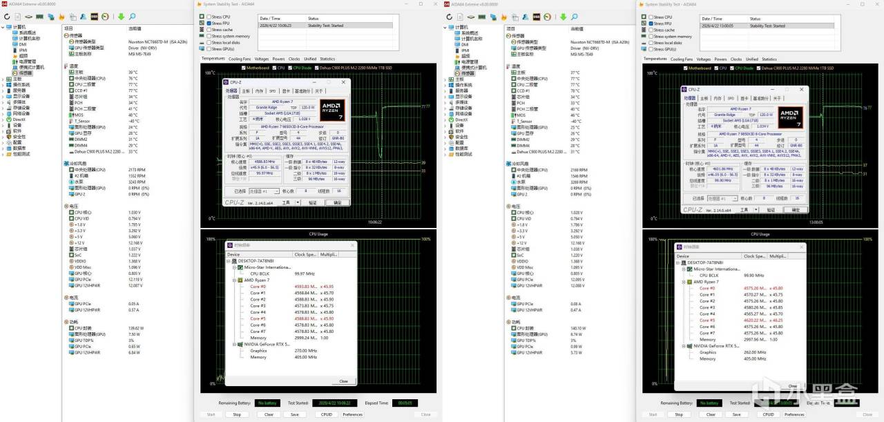 ▼單烤FPU測試,處理器功耗在140W左右,全核心睿頻4.6GHz左右,溫度在77℃左右。主板上的供電、南橋、內存、固態,均是顯卡豎裝更低一些。