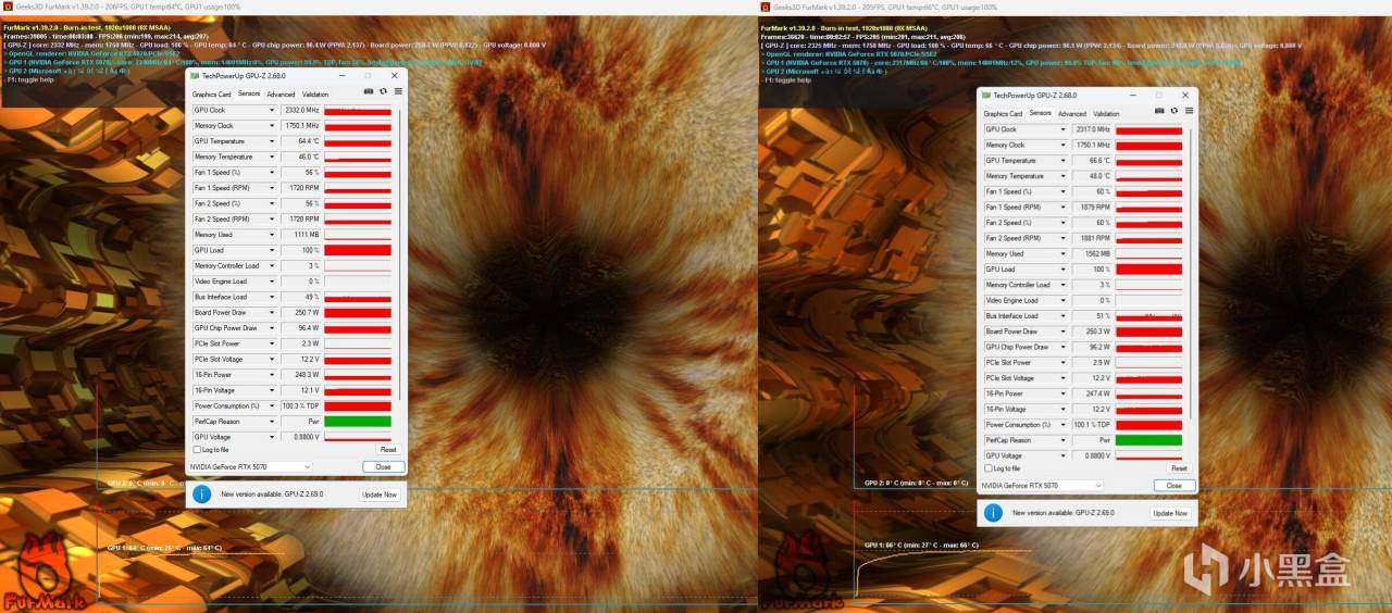 ▼跑個甜甜圈測試,橫裝顯卡核心溫度64.4℃,豎裝顯卡的核心溫度在66.6℃,顯卡核心高了2℃。