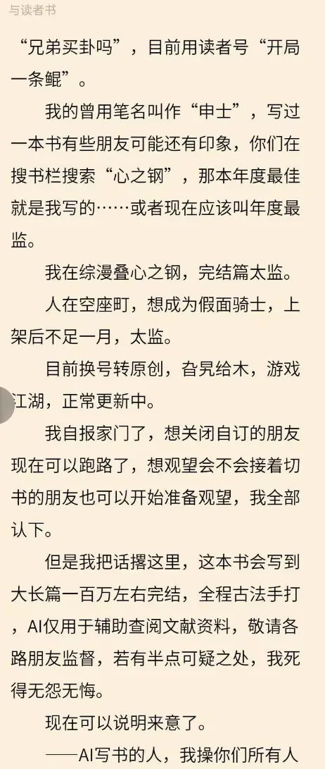 AI是輔助工具,在合理範圍內真的能幫助作者提升效率,但具體的邊界究竟在哪裏,尚且不明,至少全部用AI直出肯定是不行的。