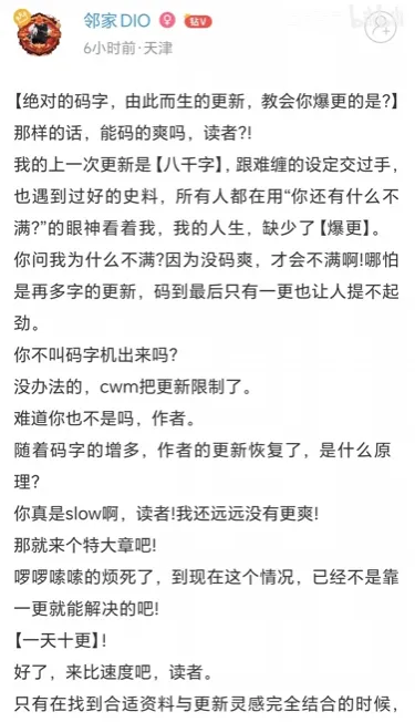 這樣的日子一個月你最多休息一兩天,而每天要更新的字數是4000-6000字,到了高潮劇情爲了連貫性還得熬夜加班,一次性寫1萬字……