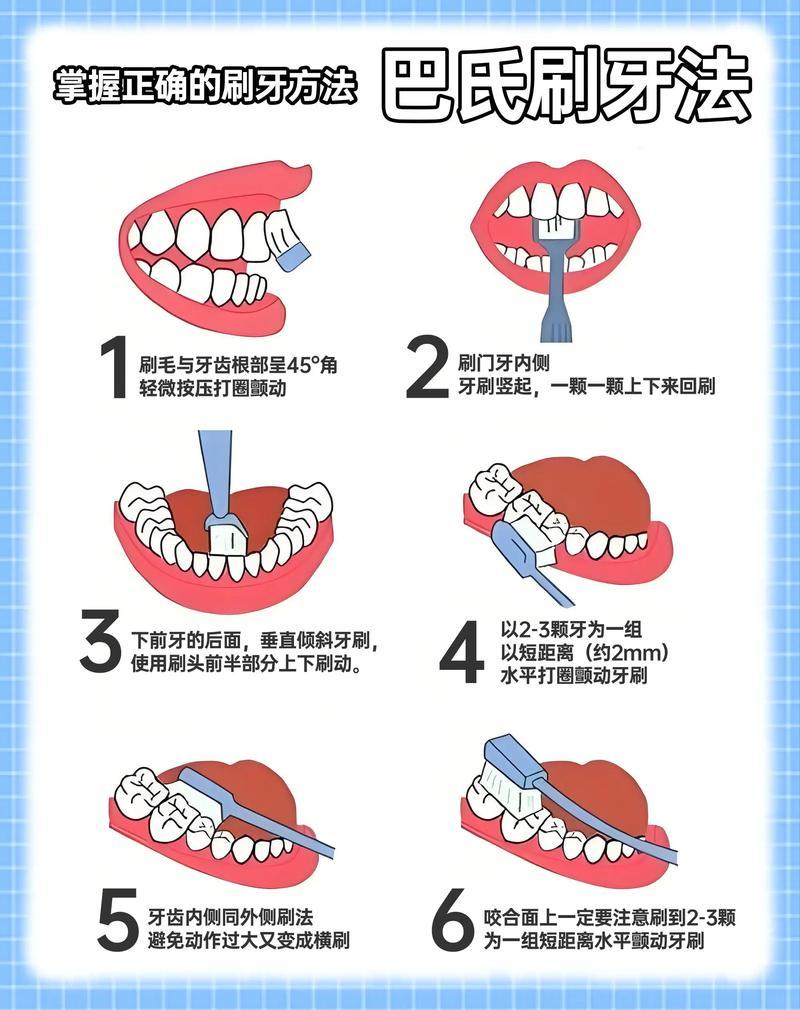 刷牙時,把軟毛牙刷的刷毛斜45度,對準牙齒和牙齦相接的溝裏,用輕柔的力度在小範圍內水平顫動,每次覆蓋一兩顆牙,再輕輕上提或下拉,把刷出來的軟垢掃走。這樣既能清走溝底的菌斑,又不會劃傷牙齦。每天早晚各一次,每次至少保證兩分鐘。