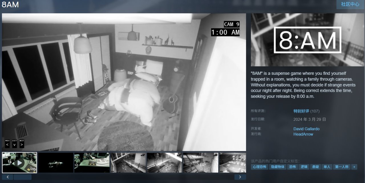 《8AM》是一款第一人稱監控類心理恐怖遊戲。你將被困在房間中,通過監視器觀察他人住宅,從午夜到早上8點尋找異常與超自然現象。玩法簡單,但氛圍壓迫感十足,非常考驗你的觀察力與心理承受能力,屬於那種越看越不對勁的類型。