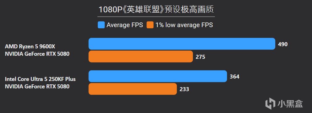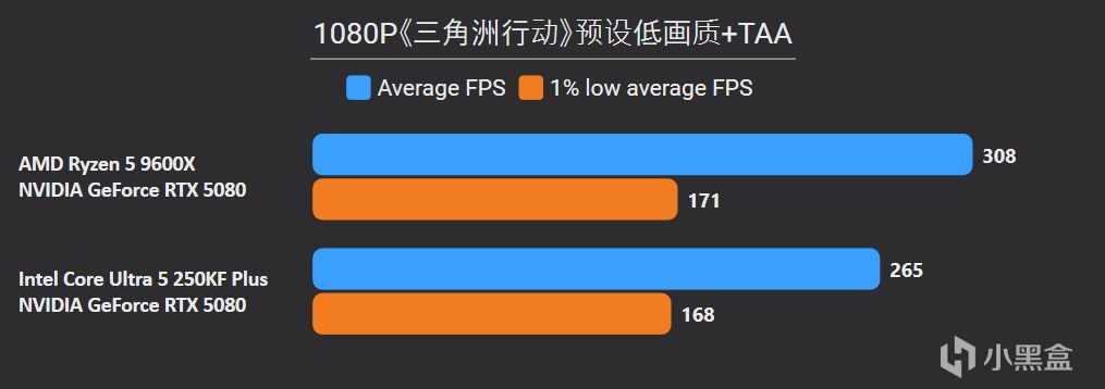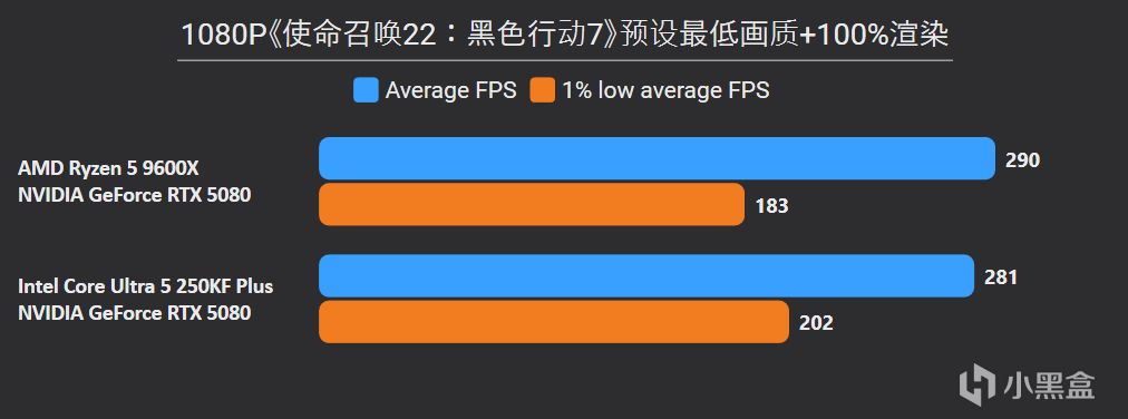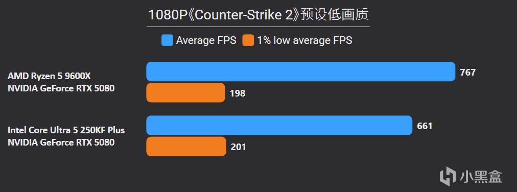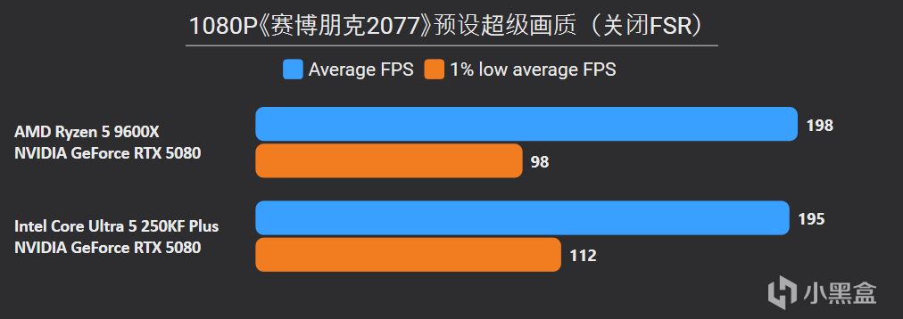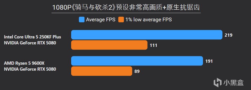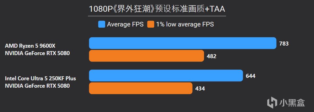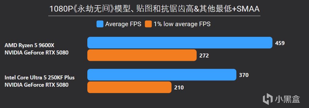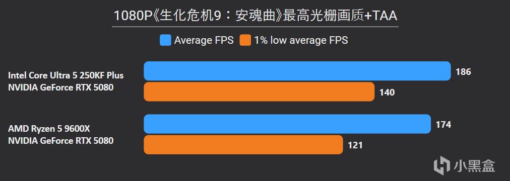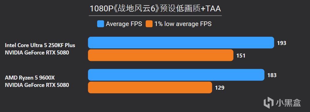經典最大程度體現CPU遊戲性能的1080P分辨率,銳龍5 9600X整體來說無疑更優勝,Ultra 5 250KF Plus能佔絕對性能優勢的只有區區3款遊戲,平均幀數來看銳龍5 9600X領先幅度高達13%,1% LOW幀也毫不讓步能有4%領先幅度。