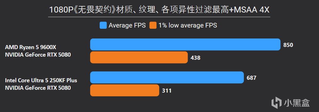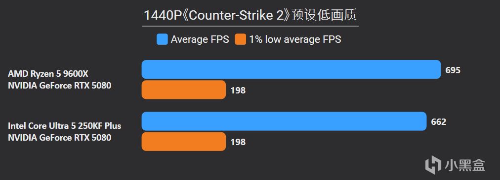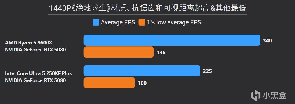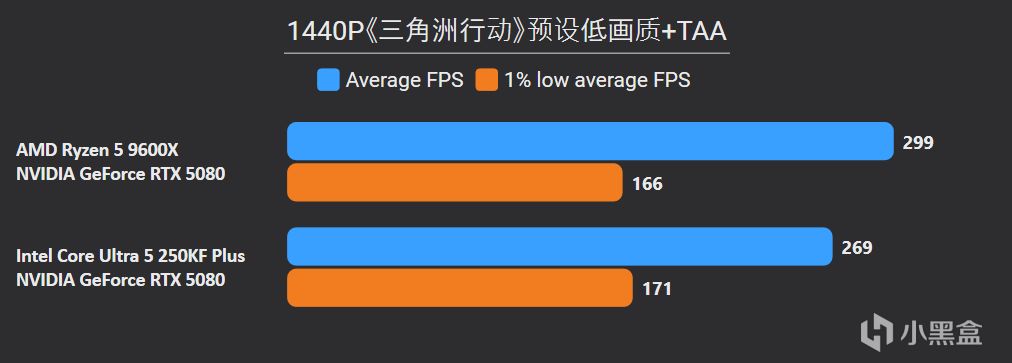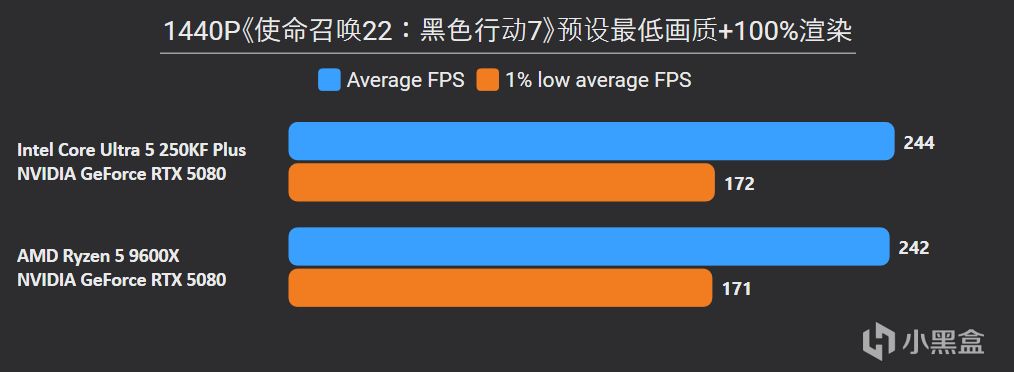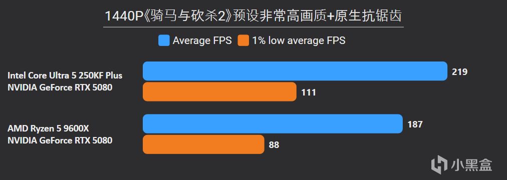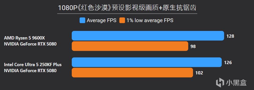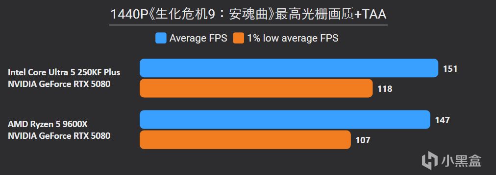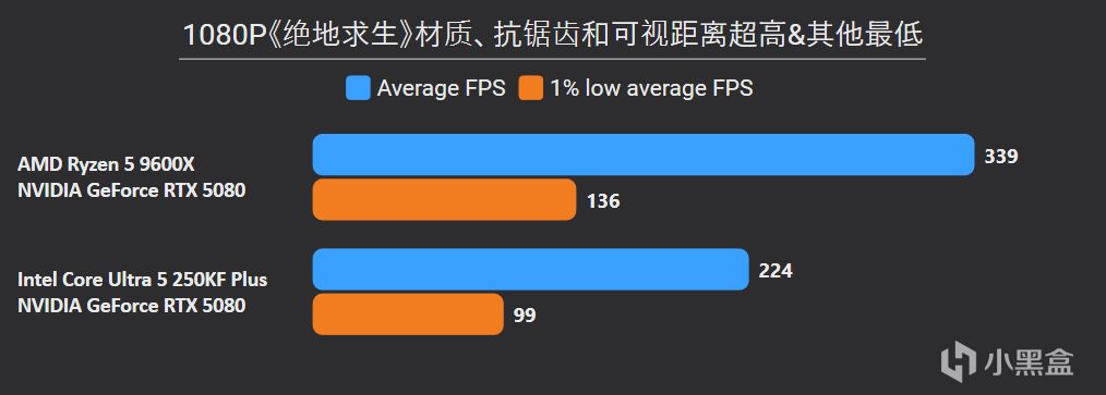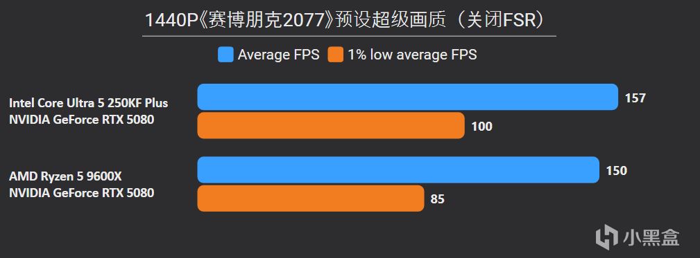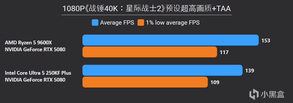 經典最大程度體現CPU遊戲性能的1080P分辨率,銳龍5 9600X整體來說無疑更優勝,Ultra 5 250KF Plus能佔絕對性能優勢的只有區區3款遊戲,平均幀數來看銳龍5 9600X領先幅度高達13%,1% LOW幀也毫不讓步能有4%領先幅度。