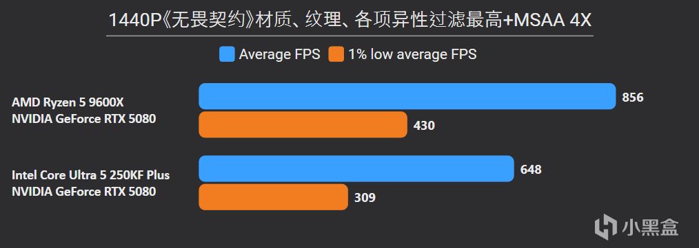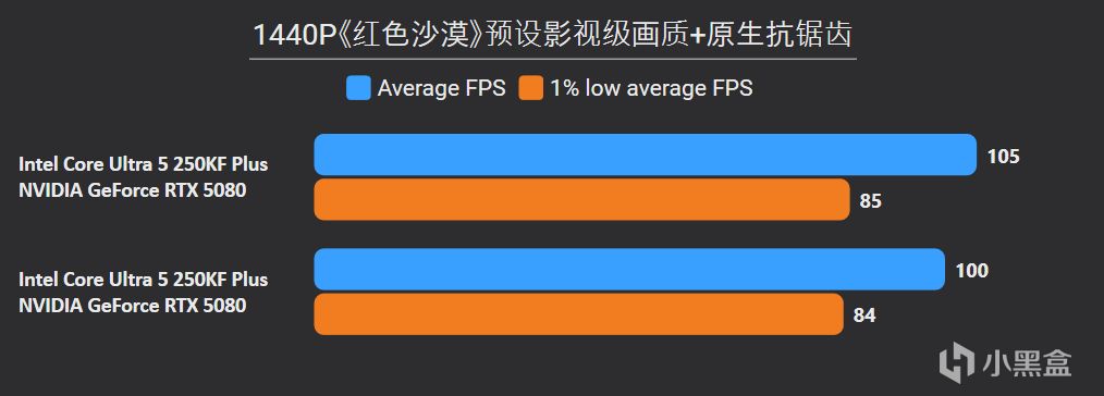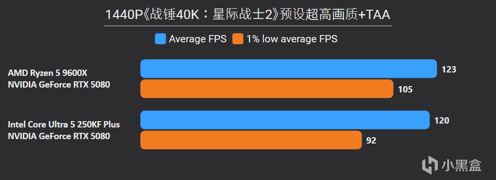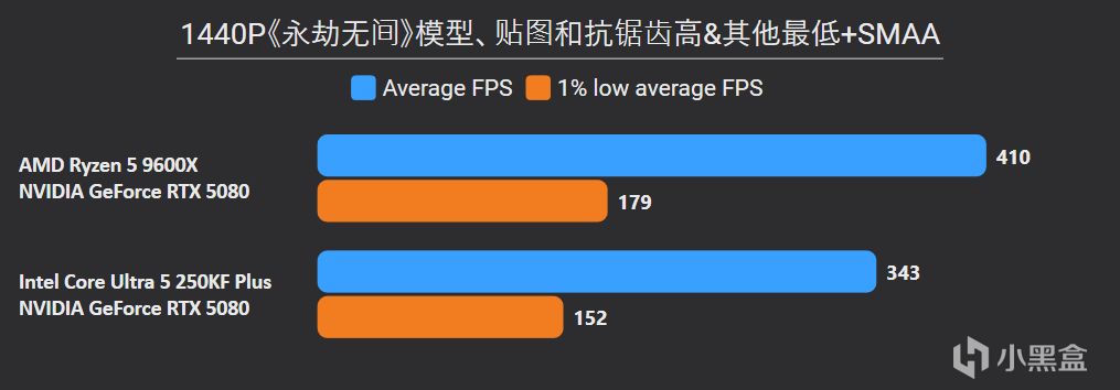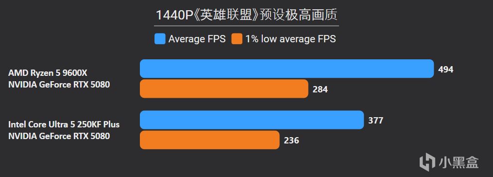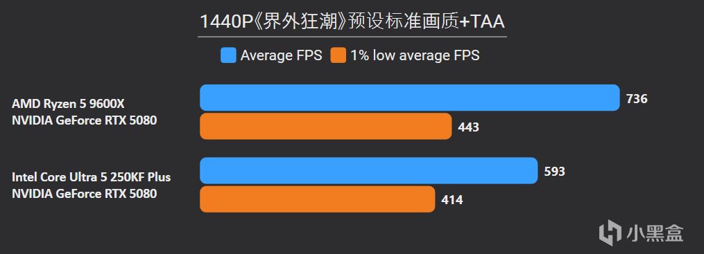 都說2K分辨率更有實際意義,結果銳龍5 9600X確實依舊壓制着Ultra 5 250KF Plus,整體平均幀領先幅度達到了10%,1% LOW幀則保持4%優勢,電競網遊項目銳龍5 9600X還是比Ultra 5 250KF Plus硬生生高一個檔次,這差距是沒法通過任何手段追平的,畢竟如果兩者都進行CPU和內存雙超,其實它們的提升幅度還是差不多的。