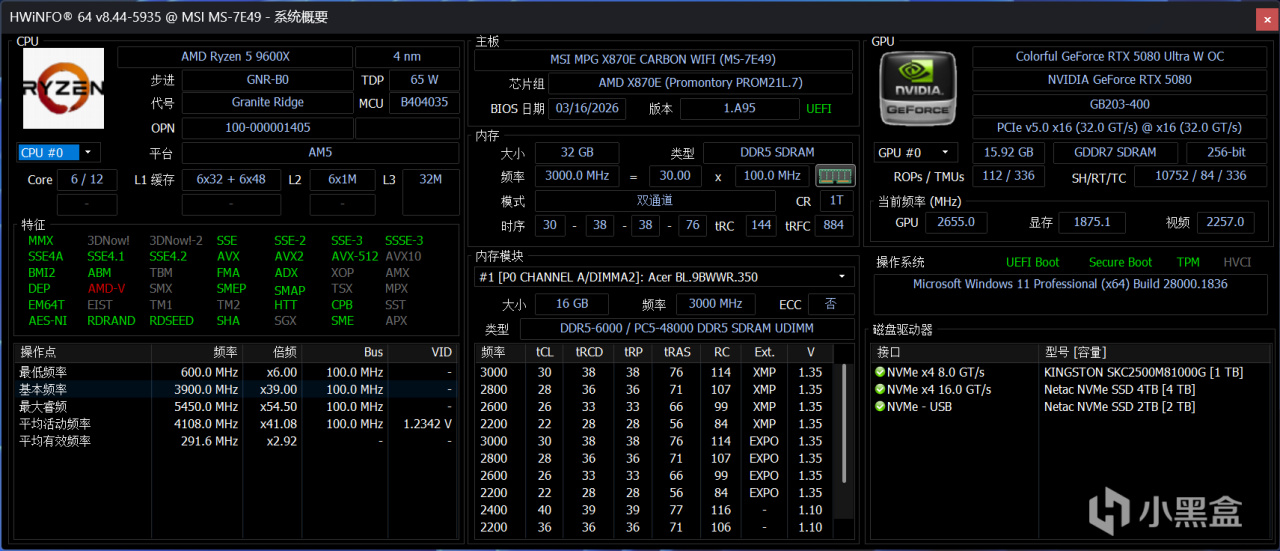 ↑銳龍5 9600X+DDR5 6000C30 16GB*2+NVIDIA RTX 5080