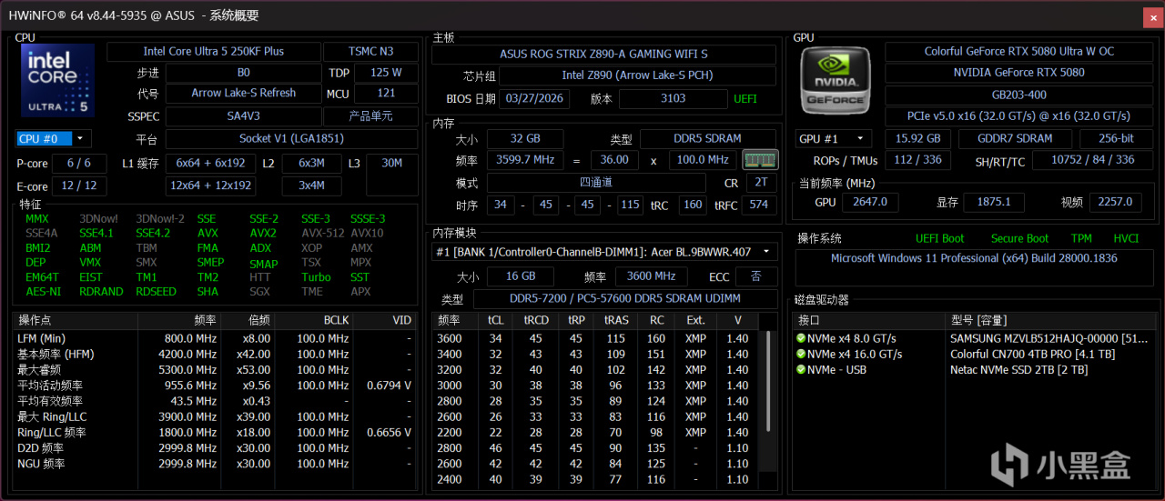 Ultra 5 250KF Plus這邊,搭配的是華碩ROG STRIX Z890-A GAMING WIFI S吹雪,設置無功耗牆限制,內存則是兩根DDR5 7200C34 16GB*2套裝,並沒有無腦上8000這種。顯卡如上統一,操作系統是Windows 11 26H1最新版本,顯卡驅動是NVIDIA GameReady 596.21最新版本。