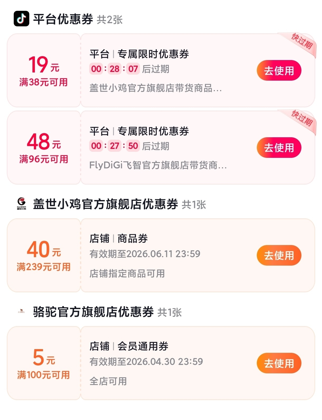 券一般是直播间券,点击“去使用”弹到直播间后,在直播间内选择要购买的商品。