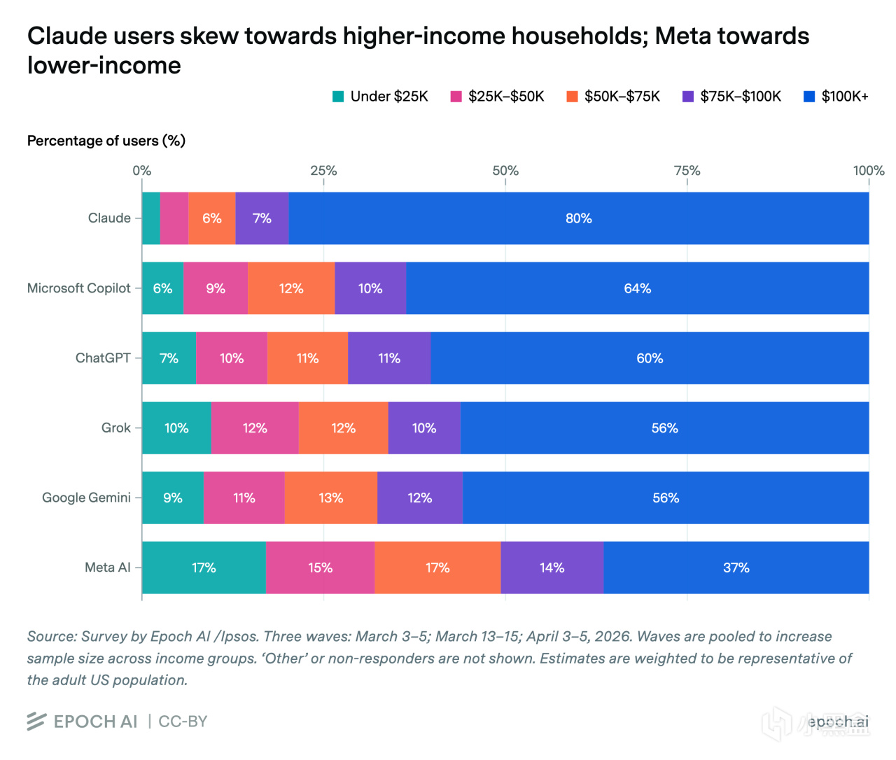 一项由Epoch AI与Ipsos联合开展的调查显示,不同人工智能服务的用户群体在家庭收入分布上存在显著差异。上周使用过Claude的美国成年人中,80%居住在年收入10万美元及以上的家庭,而Meta AI用户中这一比例仅为37%。全美约50%的成年人属于这一收入群体。