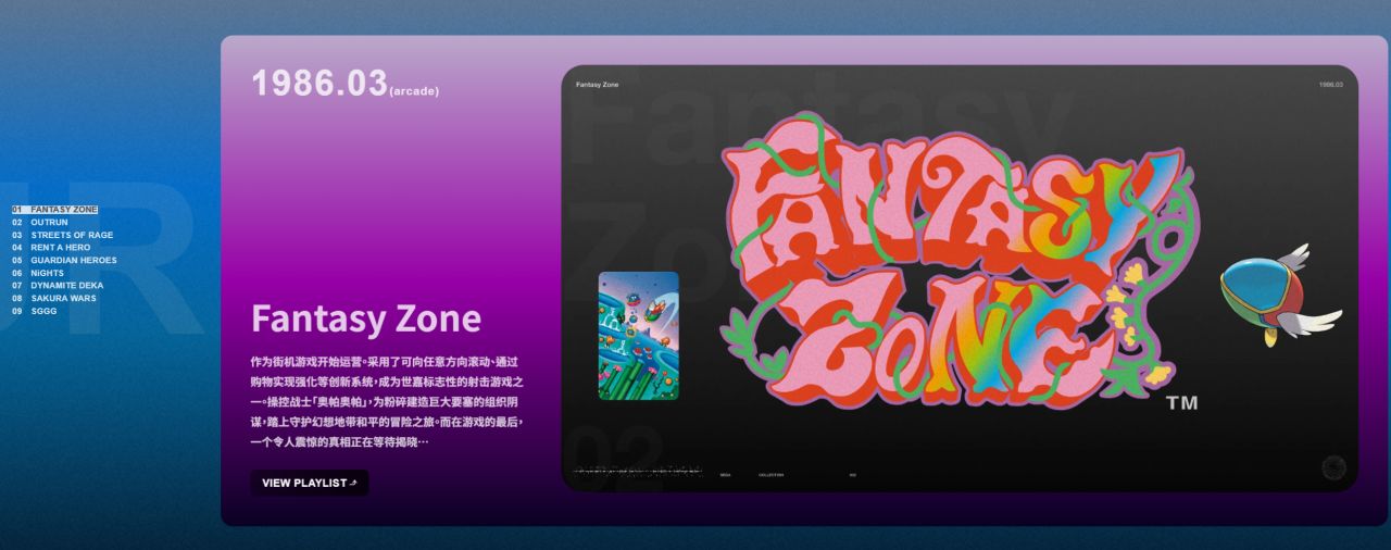 目前官方公布的IP复兴名单包括:《幻想地带》、《冲破火网》、《怒之铁拳》、《出租英雄》、《守护英雄》、《梦精灵》、《致命格斗》、《樱花大战》和《SGGG》。官网还提供了来自这些游戏、跨越街机到Dreamcast等平台的部分经典原声试听。