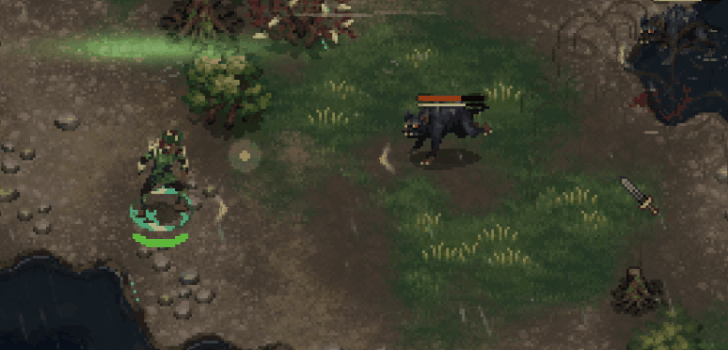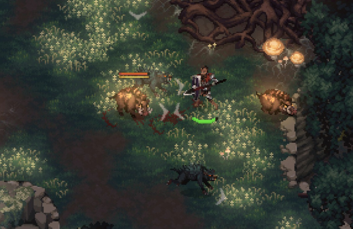 《困獸之國》遊戲的像素美術風格表現非常不錯,每一幀的像素場景的光影效果,以及人物運動的像素動畫都非常的自然流暢,另外在黑暗奇幻的畫風下,場景細節依舊在線,大部分場景以森林廢土、斷壁殘垣等爲主,讓玩家可以很直觀地感受到德洛瓦大陸的原始野性以及神祕的一面,我喜歡這個畫面風格。