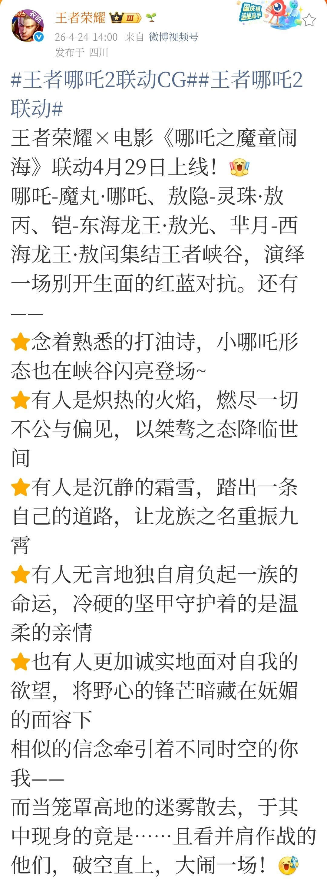 《王者荣耀》和电影《哪吒之魔童闹海》的联动,是2025-2026年跨界合作的一大热点。官方在近日发布了CG视频,正式官宣联动将于2026年4月29日上线,正好赶上游戏的“五五开黑节”版本,属于重磅内容更新。