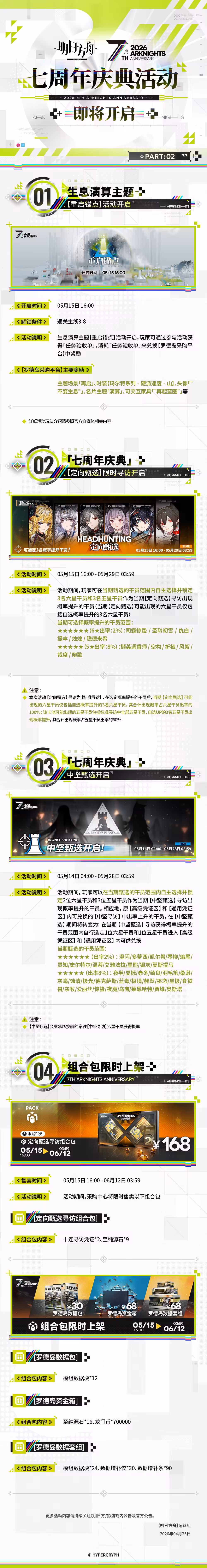 在今日的「《明日方舟》七週年慶典」特別直播節目中,鷹角網絡宣佈《明日方舟》七週年「相變臨界」活動即將開啓。