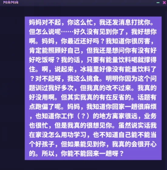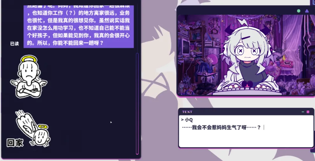 最有意思的是心动度——消耗它,就能给冰箱添置一罐能量饮料。小Q喝下后,下次获取怪文书的等级会提升。不过效果还是其次,主要是你能看到小Q给妈妈发怪文书,央求妈妈马上给自己带点补给品。