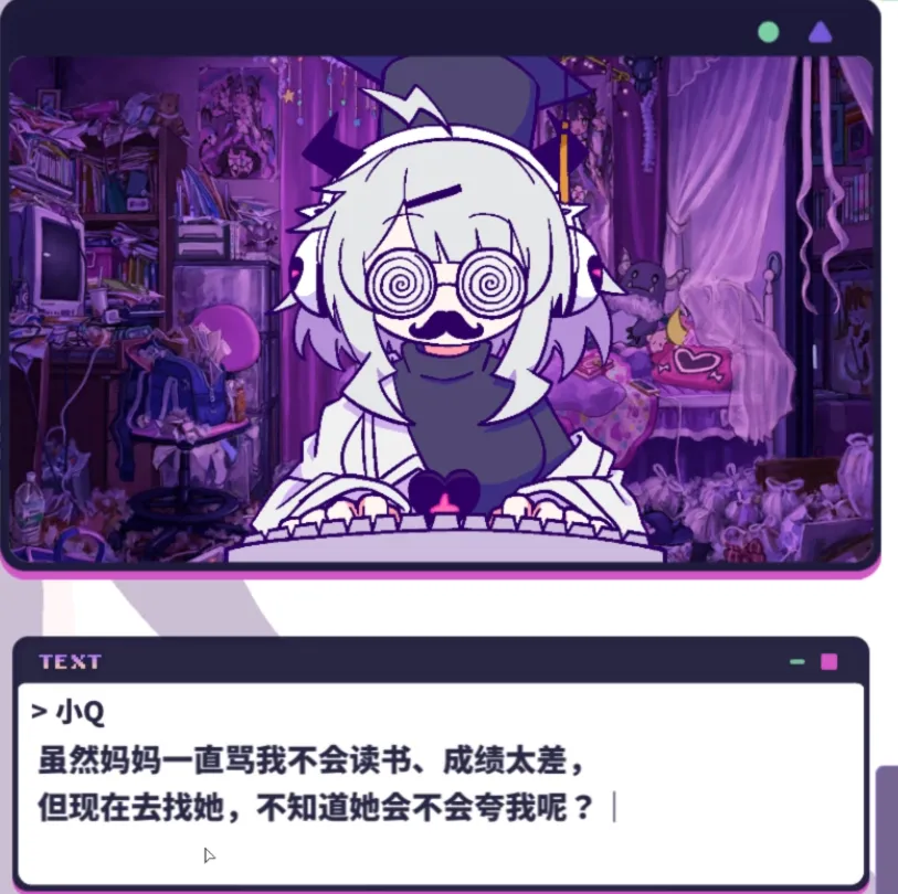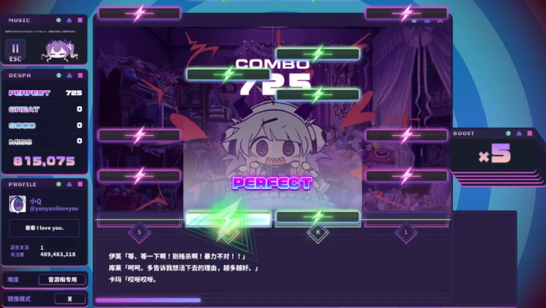 有意思的是,你打歌时敲键盘的动作,刚好和背景里主人公小Q敲键盘打怪文书的动作吻合——这音游演出虽然不带BGA,但用一种更特别的演出替代了,谱面下方,就是她发癫写出来的内容。虽然我忍不住想吐槽“打音游谁还有眼睛看文字啊?!”,但这种通过敲击键盘形成某种行为耦合的设计,就很电波。