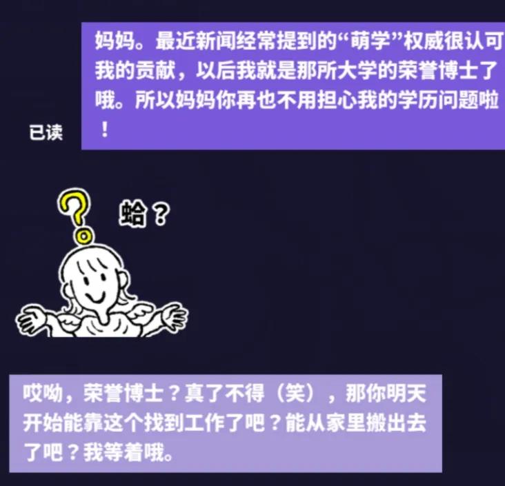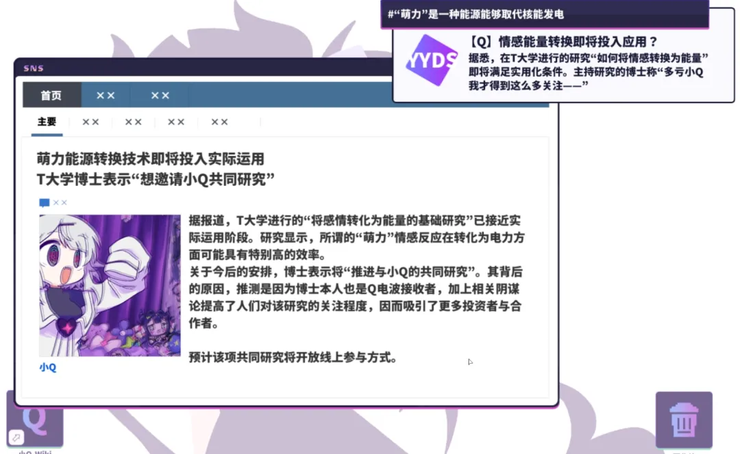 游戏中的阴谋论一旦完成,总会触发些脑洞大开的结局。比如,在小Q的怪文书和某位博士的技术下,“萌力”成为一种高效能源,让其他所有能源退入历史,世界各地都掀起了对“萌”的研究热潮。靠着对萌力的贡献,小Q成为了T大学的名誉博士。