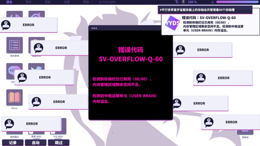再比如,游戏里有一个“平行世界是存档制,如果存档都用完就会出BUG”的阴谋论。如果你试着把60个存档填满,就真的会触发BUG,进入一段特殊的主界面演出——晕晕会告诉你,这里确实是平行世界,我们会在另一个重置点相会。