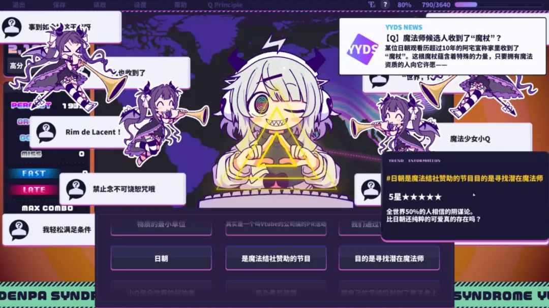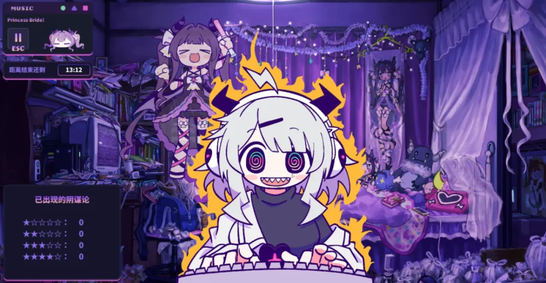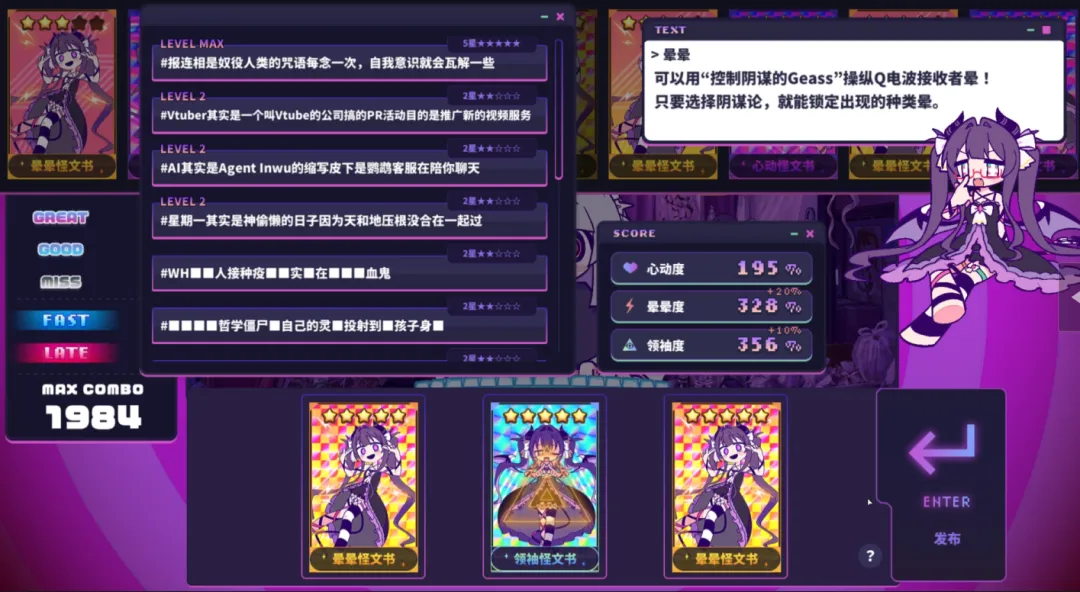 每次打完一首曲子,小Q就会完成几篇怪文书。玩家可以选择不同类型(心动、晕晕、领袖)的怪文书,按特定组合触发对应的阴谋论,并提升小Q的三维数值。