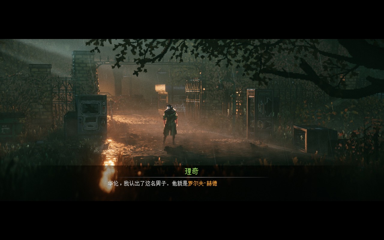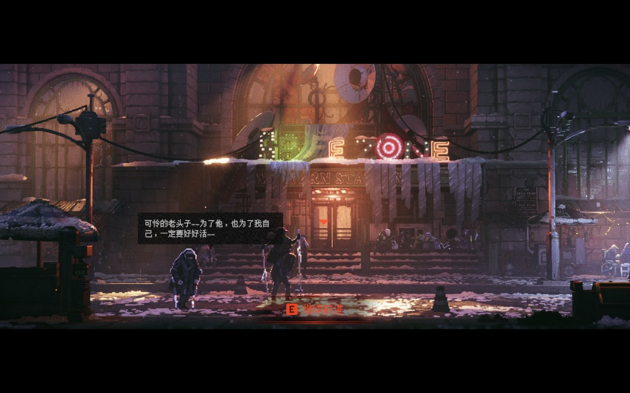 像素的颗粒感让霓虹灯光、火光和雾气呈现出独特的数字噪点质感,营造末日废土与赛博科技交织的迷幻氛围。开头玩法很步行模拟器,全程都是对赛博像素艺术的炫技。