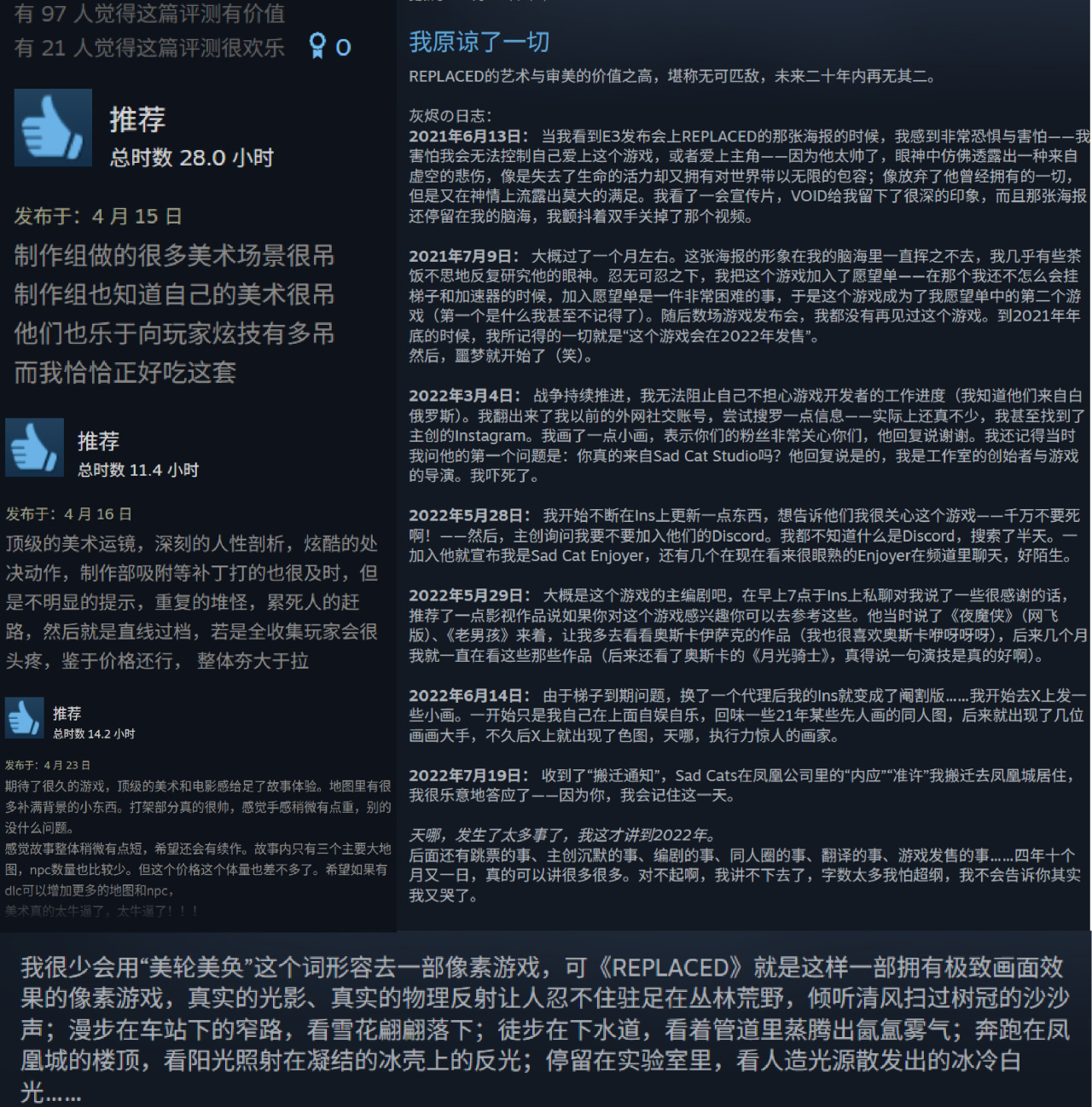 在2026年4月14日,这款让无数玩家苦等5年的《REPLACED》正式发售。夯到爆的赛博像素艺术,《REPLACED》做到了。光影、运镜、配乐、美术、世界观,没有让大家白等,但也没有做到让所有人满意。跳不完的跳跳乐、破盾的长前摇、堆怪的战斗、粘滞操作手感(如果你是奔着美术和叙事来,建议选择最低难度)。