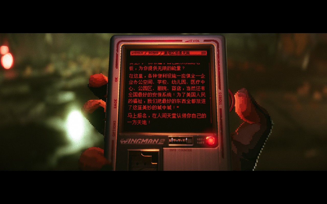 在地图的角落藏着大量的剧情碎片,通过公司官方宣传和底层人民实录的对比,更显剧情的荒诞黑色。凤凰公司用重建、天堂、医疗进步 包装自己的极权统治,而矿工日记、幸存者回忆则戳破了他们的谎言,揭露器官掠夺、暴力驱逐与阶级筛选。这种复古的UI设计好评,更有代入感。
