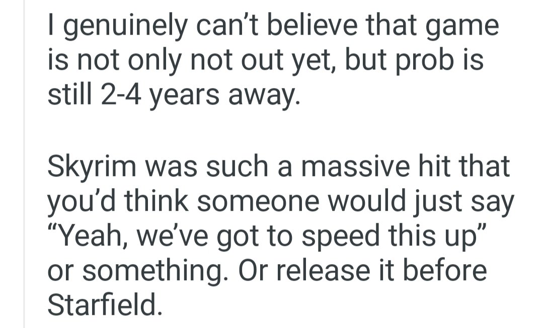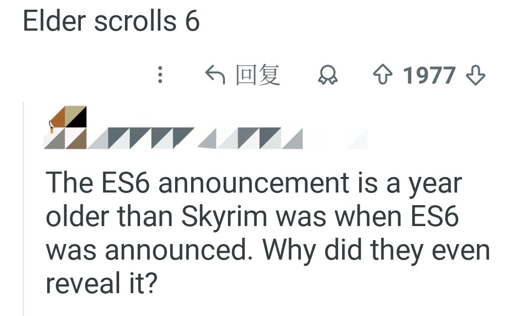 《上古卷軸6》從公佈到現在的時間長度,已經超過了當年《天際》公佈時《天際》自身的年齡,譯註:意思是《上古卷軸6》公佈至今的年頭,已經比當年《天際》發售時距離系列上一作的時間還要久了。他們當初爲什麼要公佈它啊?