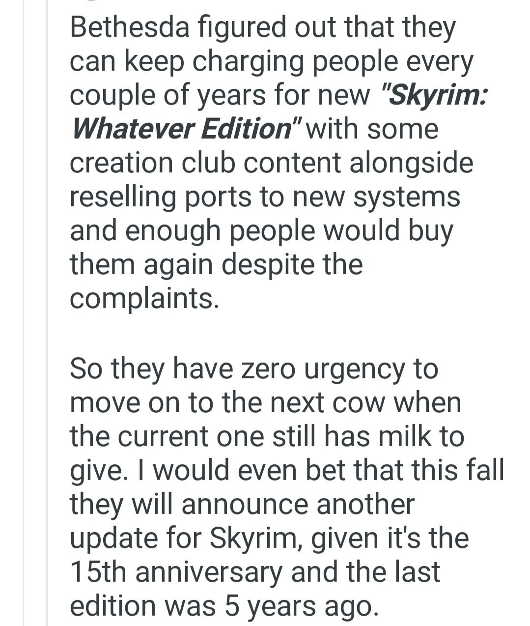 所以他們完全沒有動力去擠下一頭奶牛——反正現在這頭還能擠出奶來。我甚至敢打賭,今年秋天他們會再公佈一個《天際》的更新,畢竟15週年了,而上一個版本已經是5年前的事了。