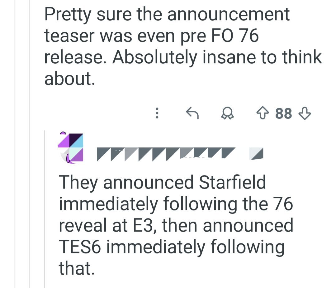 他們在E3上緊接着《輻射76》的公佈環節之後就公佈了《星空》,然後又緊接着公佈了《上古卷軸6》。