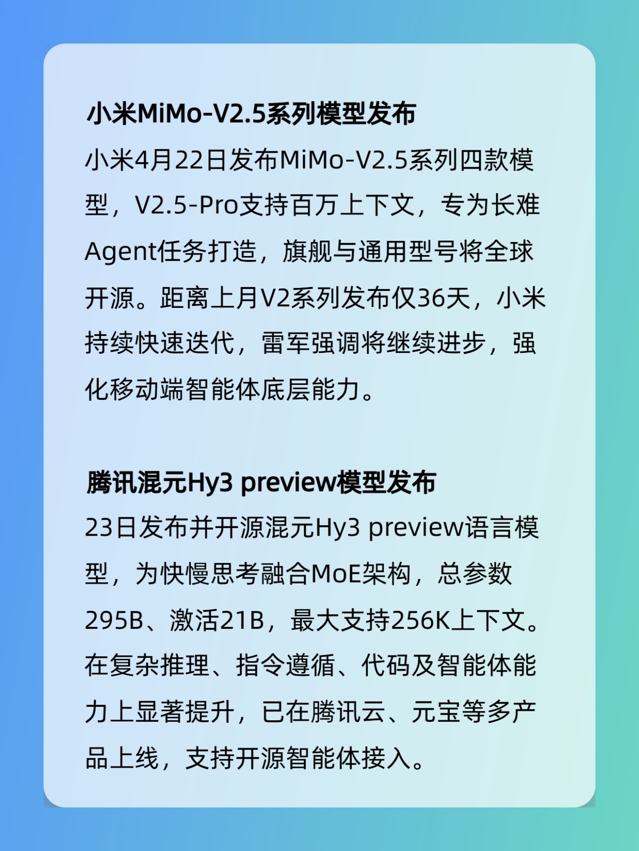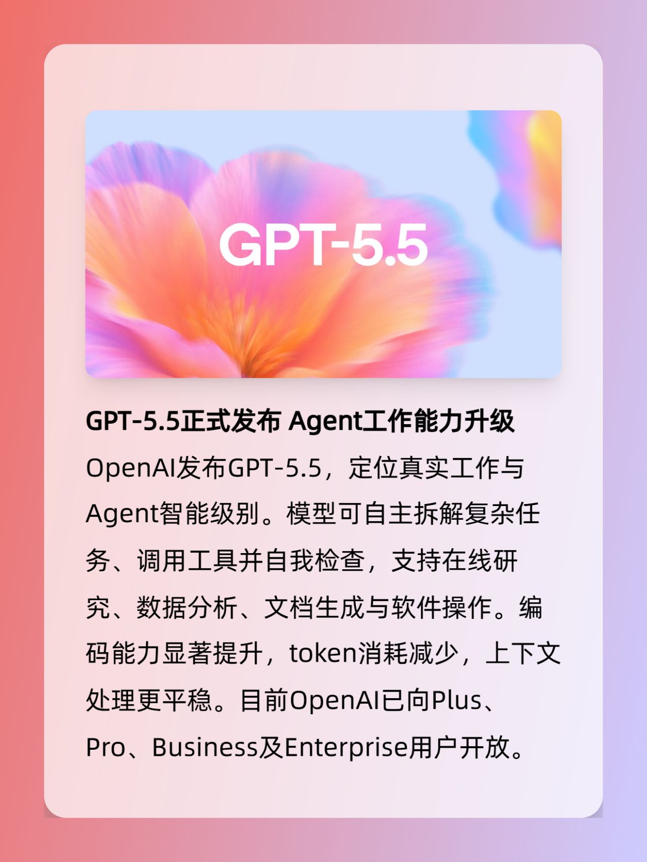 · 第二條重要新聞:OpenAI發佈GPT-5.5,強化真實工作Agent能力,支持自主任務拆解與工具調用,編碼與研究效率顯著提升;