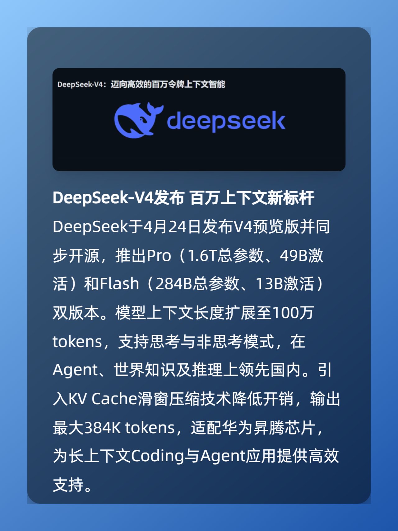 · 第一條重要新聞:DeepSeek發佈V4系列,Pro版1.6T與Flas**284B參數均支持百萬token上下文,Agent能力國內領先並同步開源;