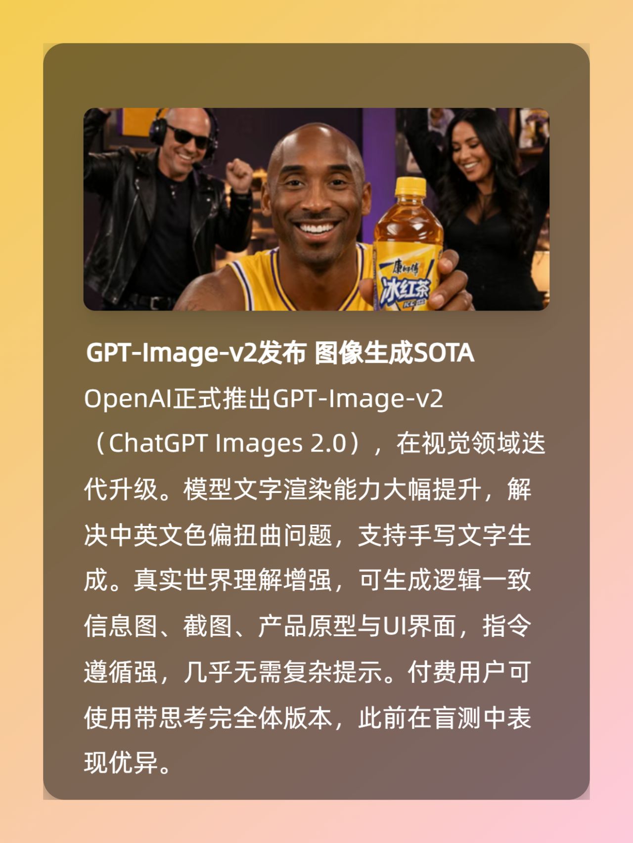 · 第三條重要新聞:OpenAI推出GPT-Image-v2,文字渲染與多語言支持優化,真實世界理解增強,可生成高質量信息圖與UI界面。