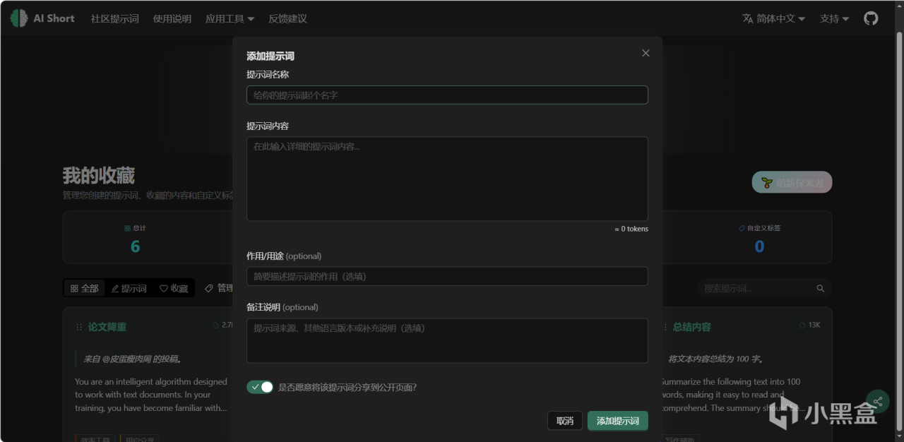 登录后可以对提示词进行收藏、添加自定义提示词。