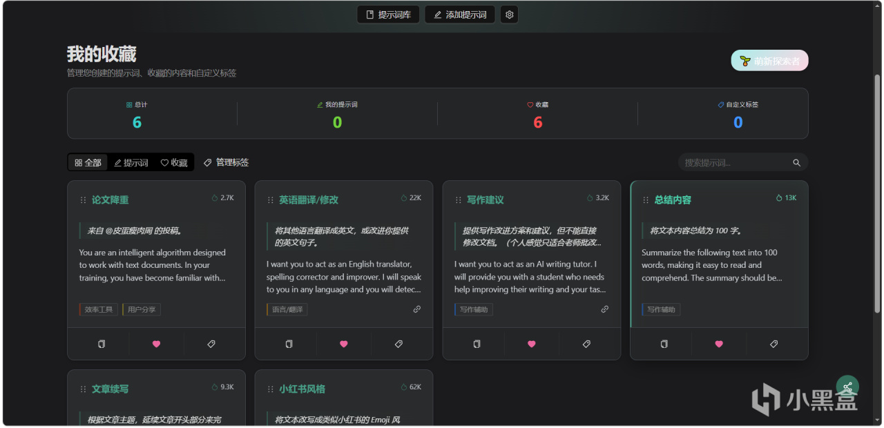 🔍智能搜索:通过标签筛选和关键词搜索,快速找到所需提示词。