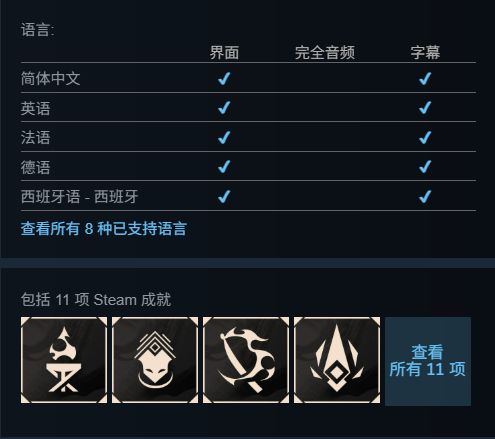 游戏包括11项Steam成就,支持简体中文界面和字幕