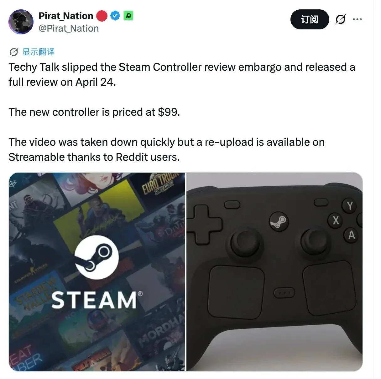 油管博主TechyTalk于4月24日率先发布了完整评测(目前已被删除)。有Reddit用户指出视频的3分37秒处提到了手柄价格为99美元(约676元)。
